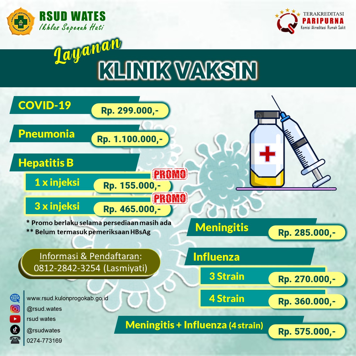 Banyak nih yang menanyakan ketersediaan Vaksin Covid-19 di Dinas Kesehatan Kabupaten Wonosobo. Sejak 1 Juni 2024 Dinas Kesehatan Kaupaten Wonosobo sudah tidak melayani vaksinasi Covid-19 ya. Namun jangan khawatir, vaksinasi Covid-19 masih bisa dilayani di Rumah Sakit maupun klinik secara mandiri (berbayar).