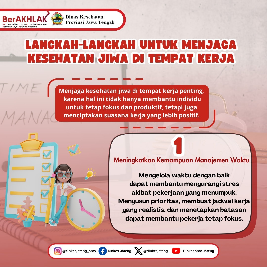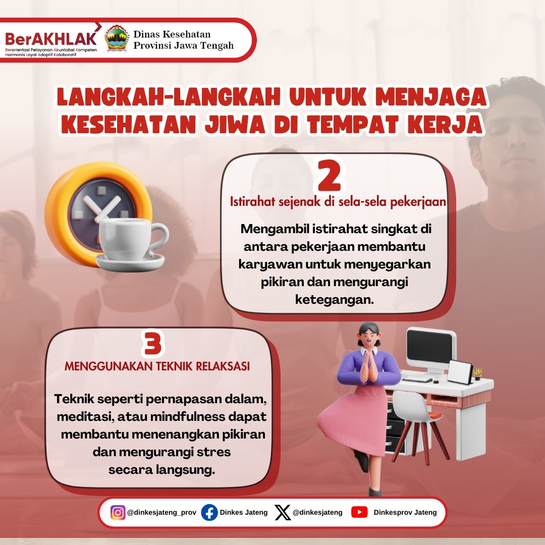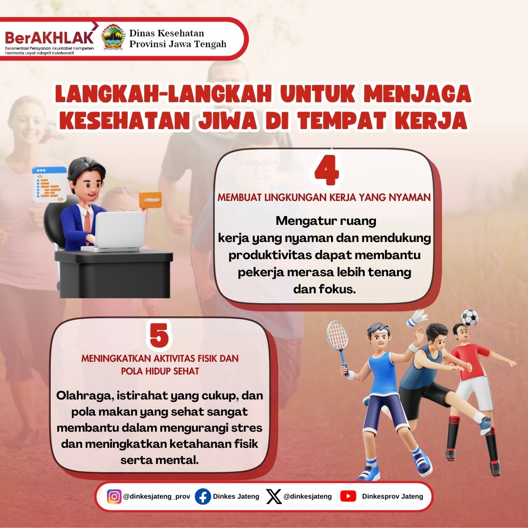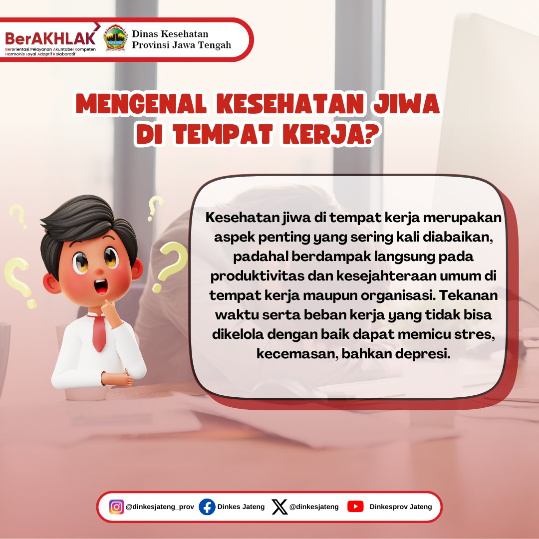 Sobat sehat, menjaga kesehatan jiwa di tempat kerja itu penting, karena hal ini tidak hanya membantu individu untuk tetap fokus dan produktif, tetapi juga menciptakan suasana kerja yang lebih positif. Masih dengan mengusung tema Hari Kesehatan Jiwa Sedunia Tahun 2024 yaitu "Saatnya Memprioritaskan Kesehatan Jiwa di Tempat Kerja" mari kita pelajari bersama langkah-langkah apa saja yang dapat dilakukan untuk menjaga kesehatan jiwa di tempat kerja ya!